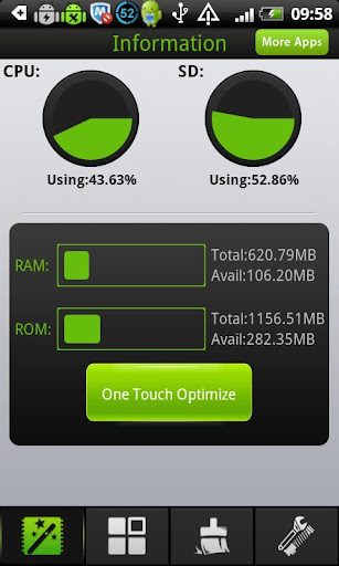 Otimizador One-Touch é uma ferramenta que permite otimizar o sistema do telefone efetivamente terminando processos desnecessários e limpando dados da cache para acelerar a performance. Pode otimizar facilmente o sistema com a widget do ecrã principal, muito fácil de usar!