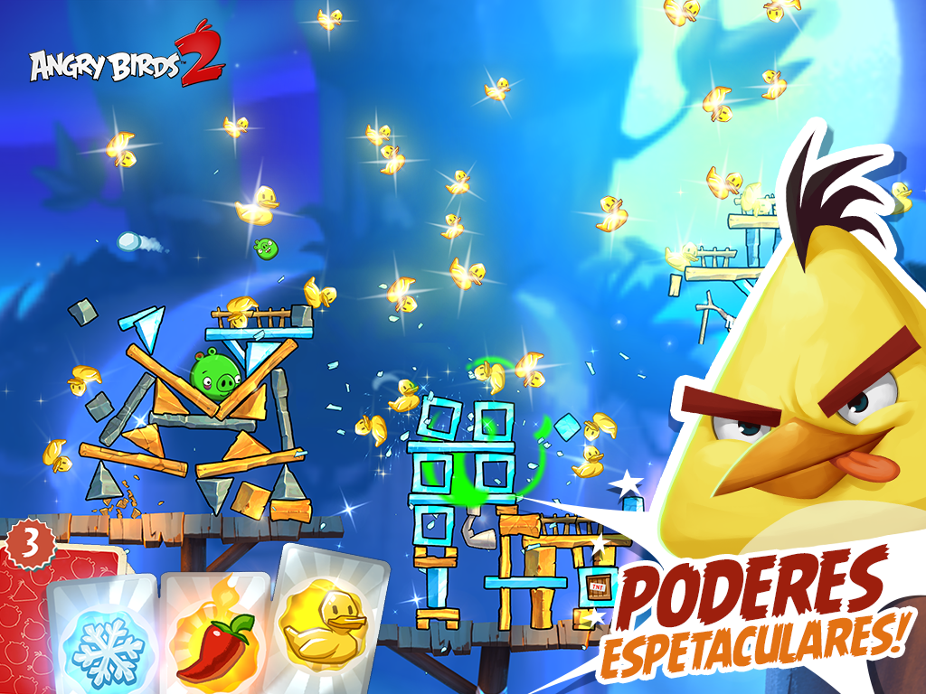 A estratégia definitiva com o estilingue – VOCÊ escolhe o pássaro que vai lançar em seguida! “Mas assim fica mais fácil, não?” ERRADO! Você precisa escolher com cuidado se não quiser que seus ovos virem omelete. Além disso, destrua os blocos para encher o Destrutômetro e ganhar pássaros a mais!